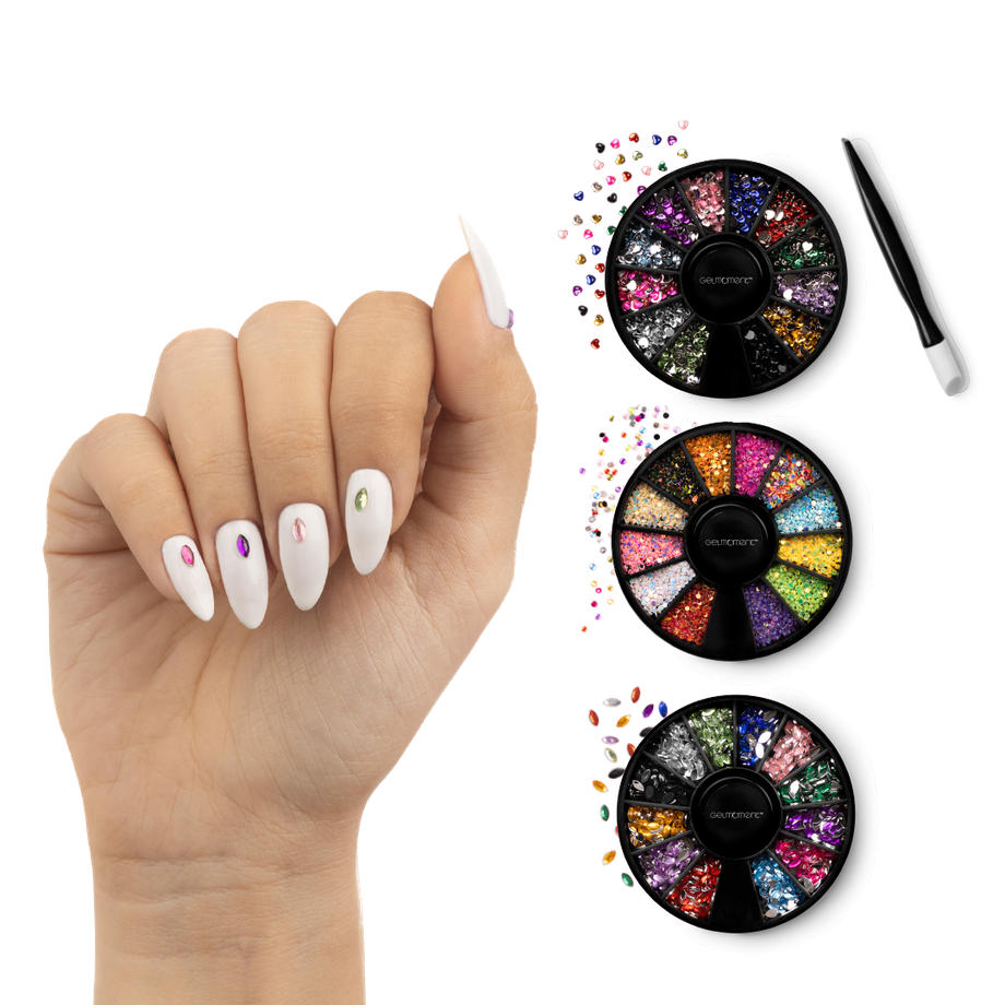 Mini Jewels are an ever-so-charming way to add a sparklingly lavish dimension to your manicure. Each set comes with 12 colours and an applicator stick, bundled together in a GelMoment organza sachet.